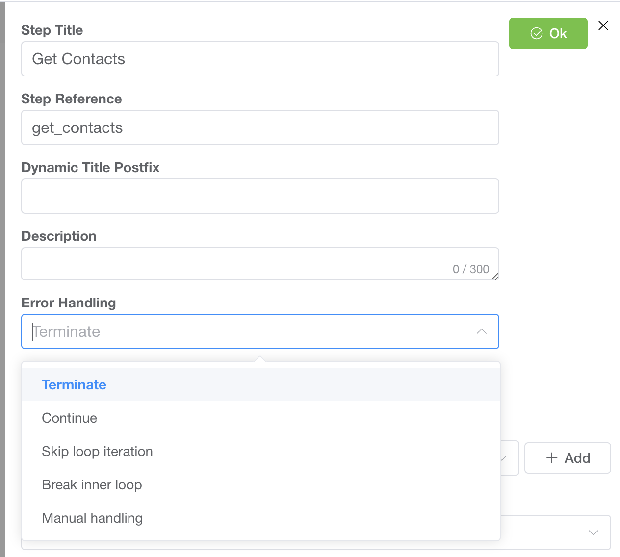 You can **set error handling on each connector** of a flow by opening it and clicking the edit button next to its name, where you find a dropdown with the available options: