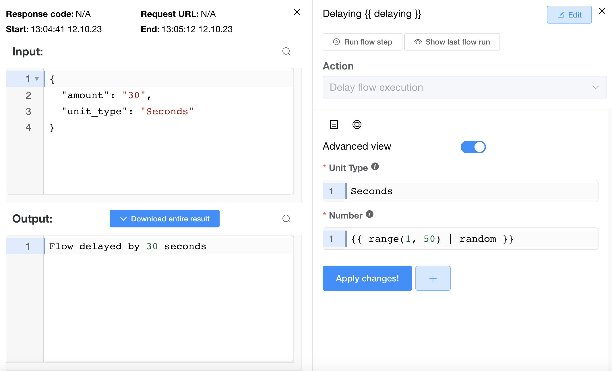 Using advanced mode, you can also make the delay dependent on the flow contents or even random: