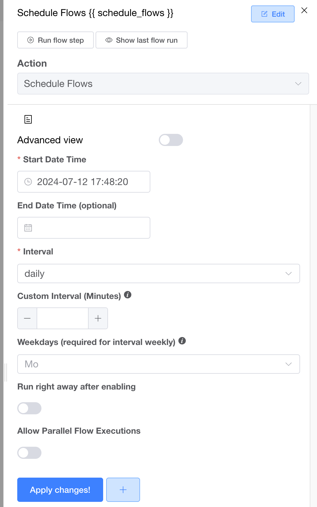 On the screenshot, you see the options you have for scheduling flows: