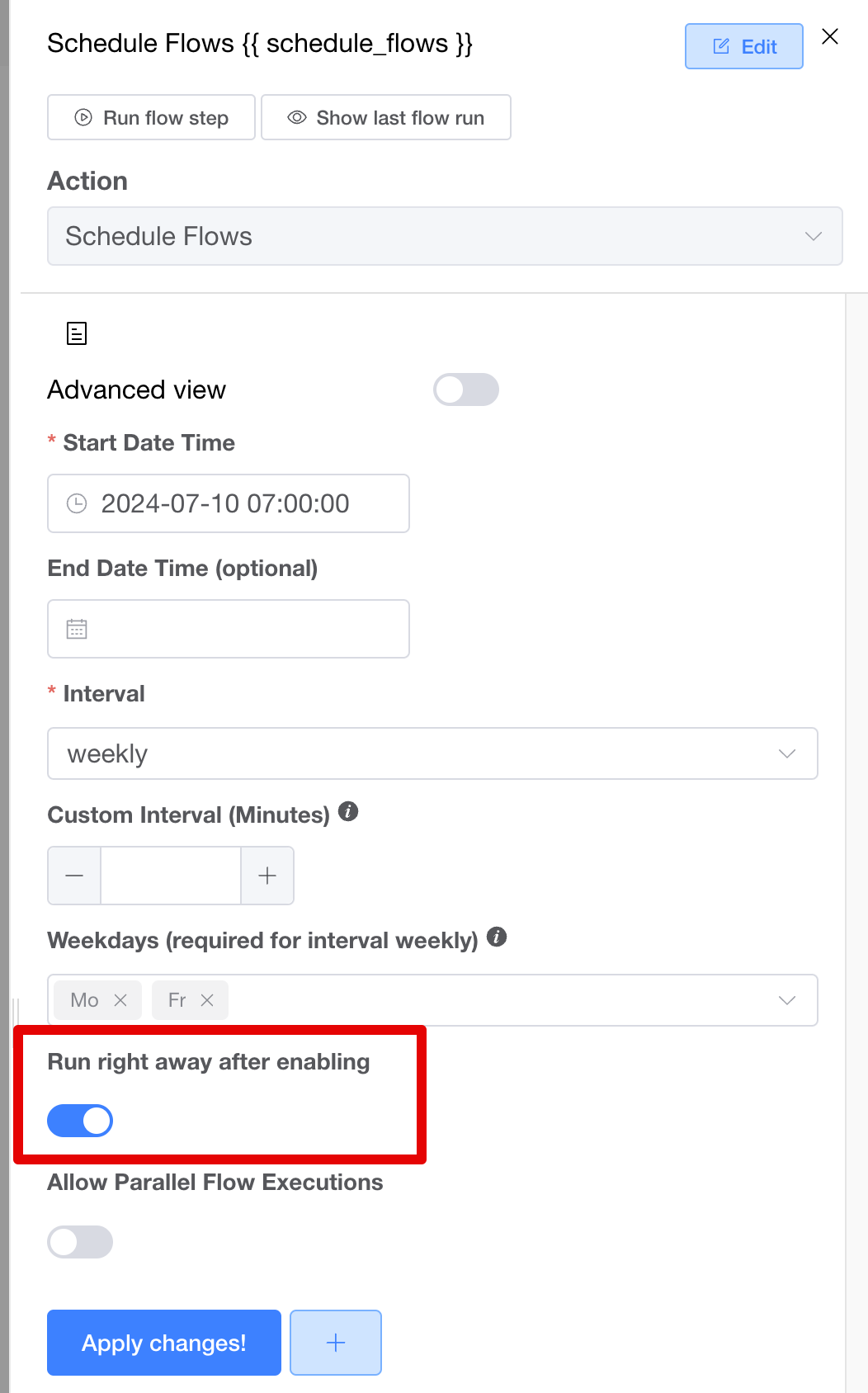 The **Run right away after enabling** setting controls whether the Flow should start immediately after being activated. When this option is enabled, the Flow will run right away under these conditions: